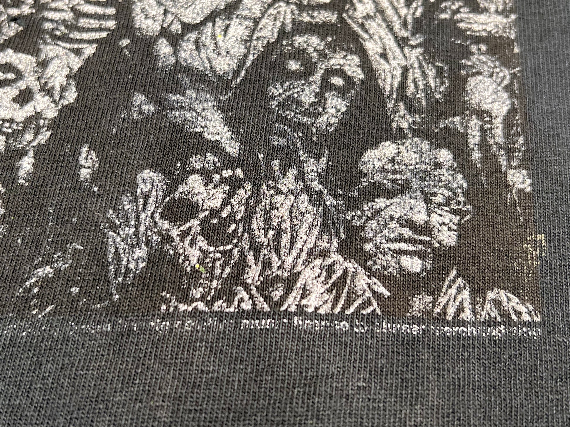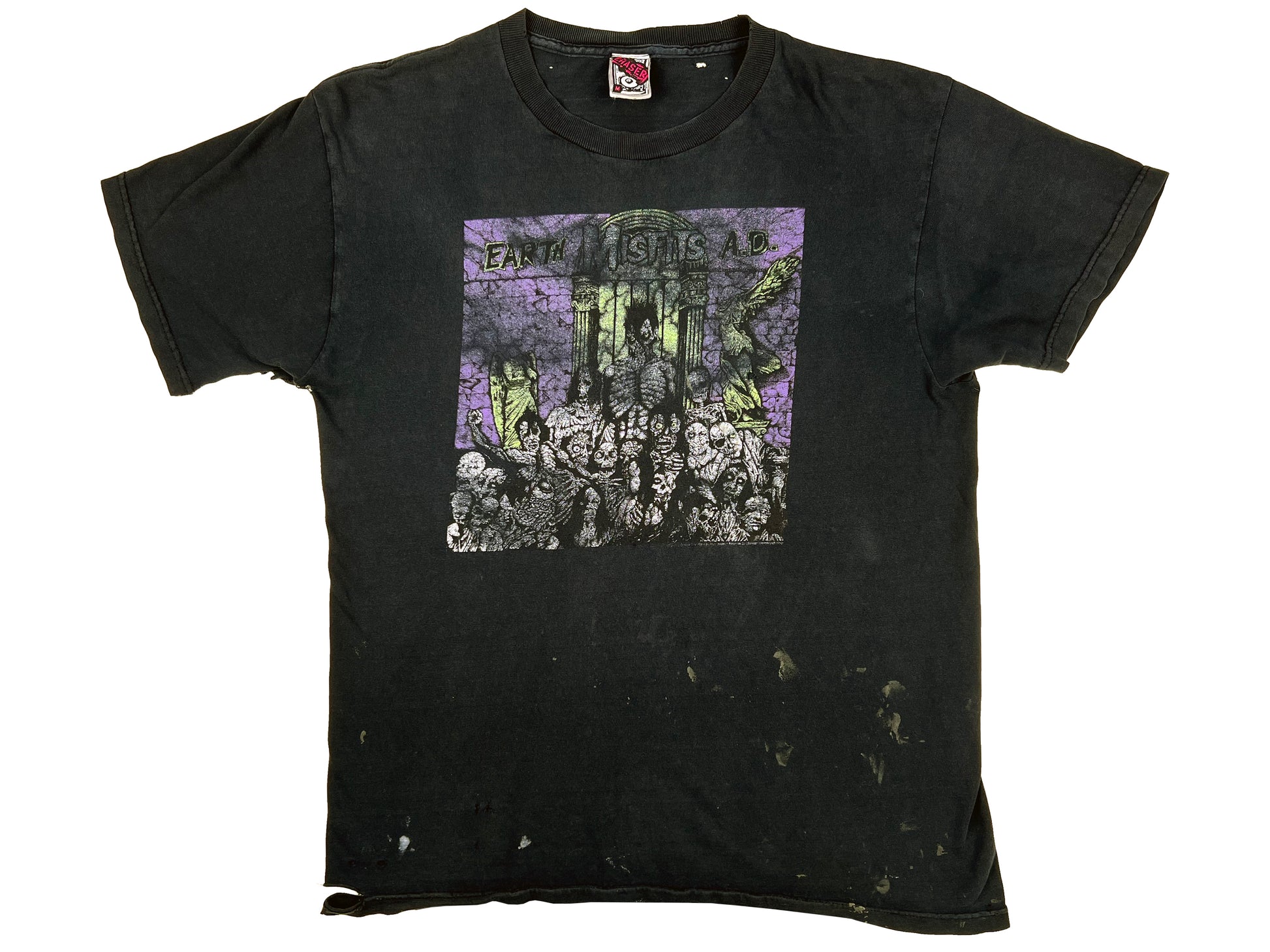 Comments: T-Shirt is in good condition. Lots of wear and fade. Graphic on the front, no graphic on the back. Some holes throughout. Seam on the right sleeve is open and hole in right armpit.